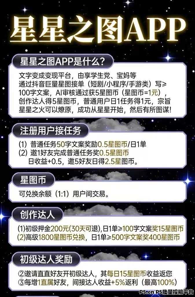 (1)普通任务50字文案奖励0.5星图币/日1单(2)邀1好友完成普通任务奖0.5星图币
